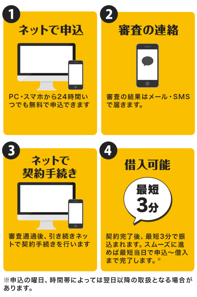 ※借入限度額は審査によって決定いたします。申込の曜日、時間帯によっては翌日以降の取扱となる場合があります。